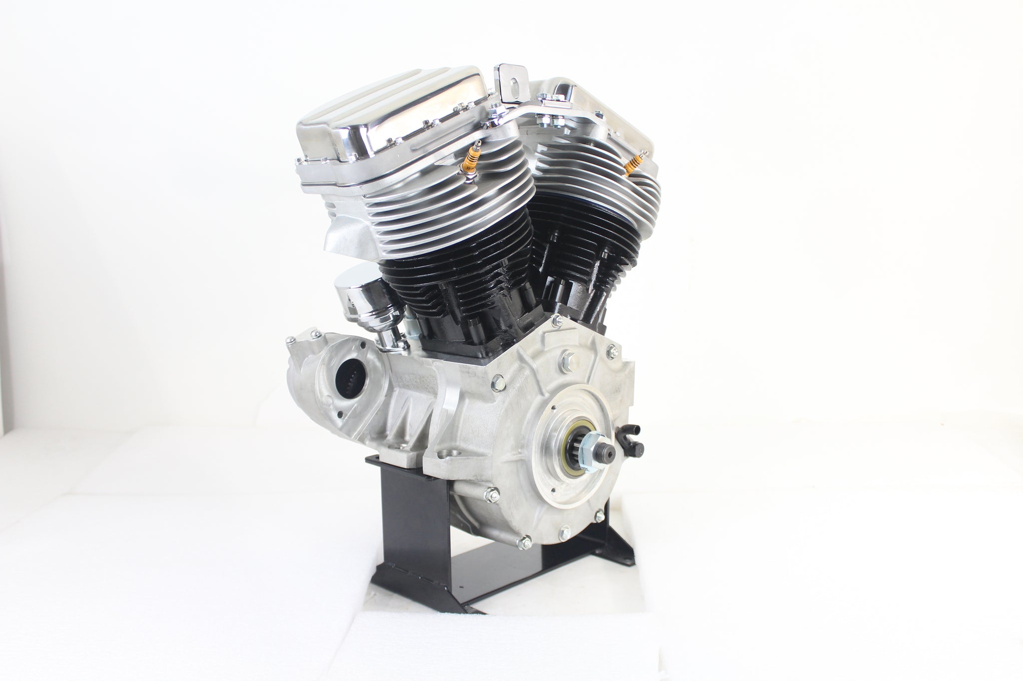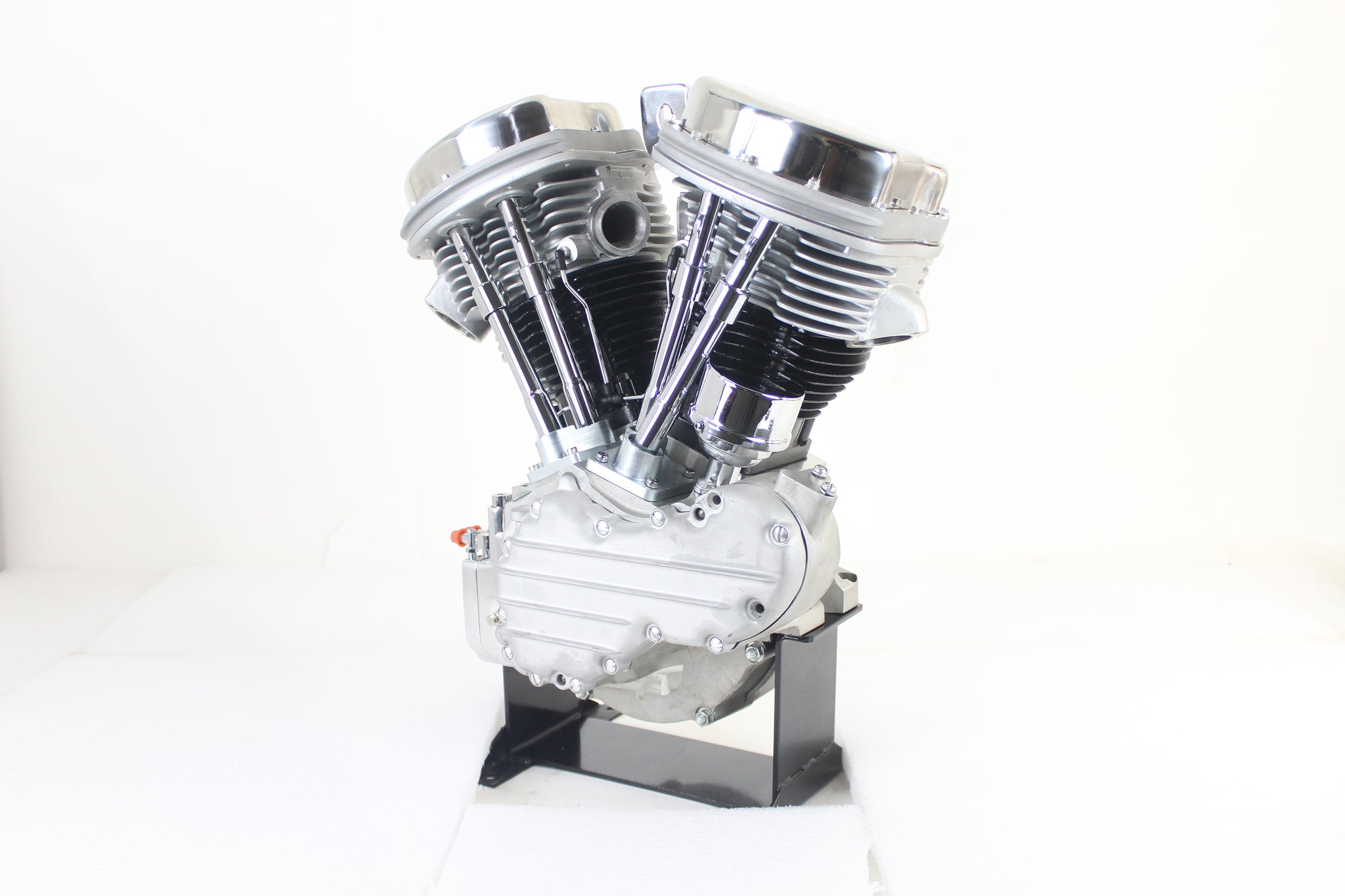 Bastardo panhead long block motor with 4-1/4 stroke is assembled and tested for oil pressure. Assembled with stock height 3-5/8 cylinders. **NOTE: Carburetor and charging system is not included. Manufacturer's Statement of Origin is supplied. *NOTE: Panhead with Shovelhead power features: Shovelhead intake and exhaust valves and the exhaust ports are Shovelhead style to accept single bolt Shovelhead flanged headers. Redesigned intake ports accept a Shovelhead o-ring intake manifold. This motor breathes and runs like a Shovelhead. Stock bore and cubic inches.