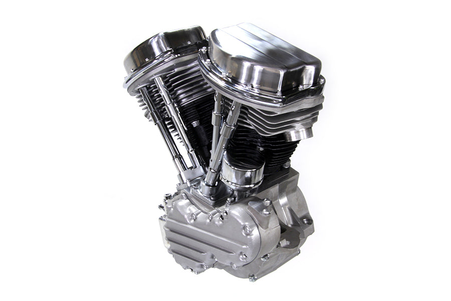 Assembled and tested for oil pressure with alloy finishes. Panhead 74 long block features V-Twin Replica case set polished Sifton oil pump and breather assembly stock stroke flywheel hydraulic lifters tapered bearings and the stock cam installed with a matched pinion gear. Cylinders are stock with 8.5:1 compression cast pistons & Hastings rings. Top end includes single plug Panheads fitted with rocker arm assemblies chrome pan covers with thick natural cast D rings and chrome steel pushrod covers. Order manifold carburetor and 2 brush generator sepately. Automatic advance distributor and cast finned cam cover are included. Entire unit is pre run and factory tested for oil pump pressure. Manufacturer's Bill of Sale is supplied. **NOTE: Carburetor intake manifold and charging system is not included.