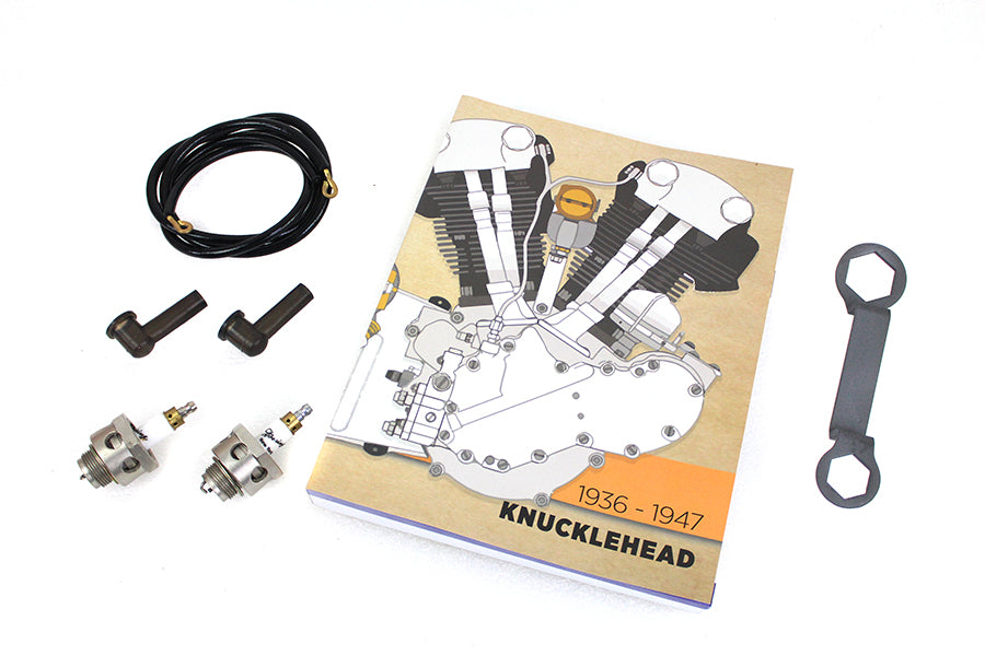 Knucklehead 18mm spark plug and wire kit includes 18mm x 7/8 replica hex Doering #3 spark plugs wire boot set wrench and a parts book.
