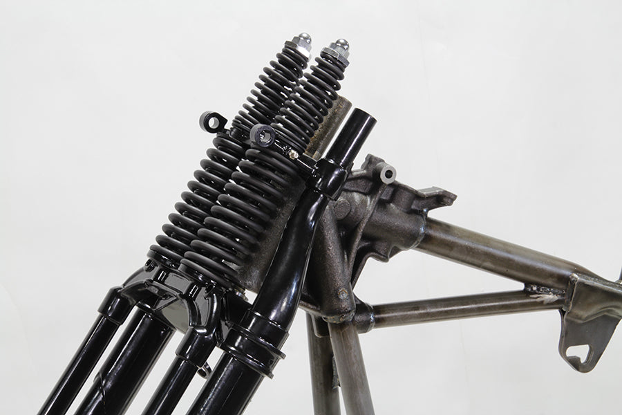 Frame and fork kit inlcudes a replica retro rigid 30° rake frame and 32 inline spring fork assembly that features a black finish. Frame will accept Panhead or Shovelhead engine with 4-speed transmission also accepts Knuckle or Flathead engines with use of a 3/8 front engine mount spacer. Features seat post axle transmission plate mechanical brake cross shaft bushings tool box mount and grease fittings already installed. Crossbar features a cable mount tab under the gas tank. Forged parts include: Neck front and rear engine mounts side car mounts top seat post yoke footboard tabs and rear axle plates. Neck will ac cept key lock. Must order lower tank frame mount separately. *NOTE: Seat post and cross shaft bushings may require further reaming for proper fit. Therefore frame will not be accepted for return (RGA). *NOTE: There are no serial numbers stamped on the replica frame. V-Twin MFG supplys a Bill of Sale only referencing the part number. *Note: UPS may consider this partas packaged oversize for shipment as compared to actual weight which will result in higher shipping costs.