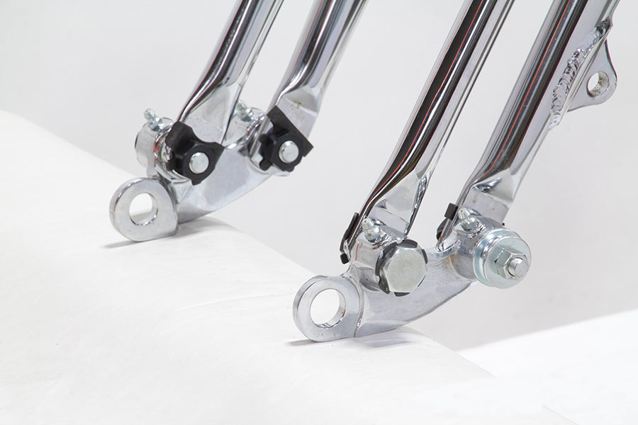 Frame and fork kit includes replica wishbone frame kit and 28 offset spring fork assembly that features a chrome finish. 30° neck wishbone frame includes seat post transmission plate and rear axle kit. For mechanical brakes only. *NOTE: There are no serail numbers stamped on the replica frame. V-Twin MFG supplys a Bill of Sale only referencing the part number.