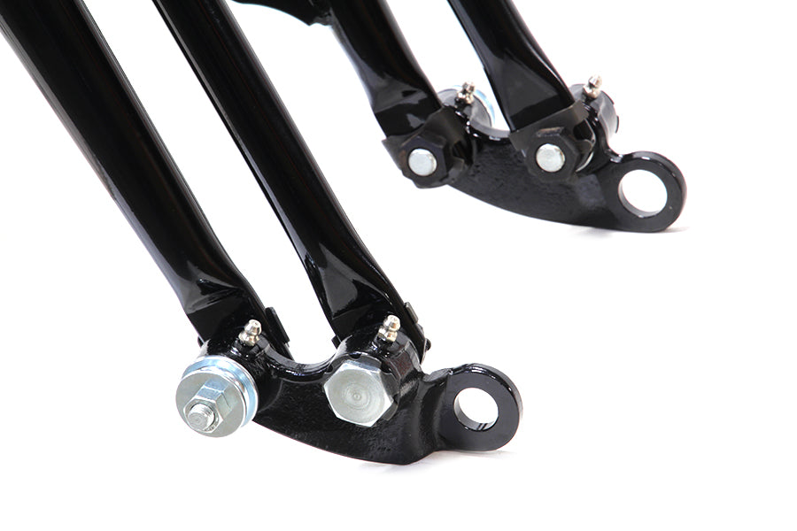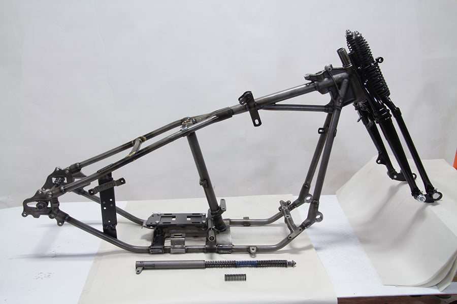 Replica Knucklehead Bull Neck frame assembly includes seat post and transmission mount plate. Assembly includes a black 18 offset Spring Fork assembly a rear axle assembly and a brake cross shaft with bushings installed. Must order neck cup and race separately. *NOTE: There are no serial numbers stamped on the replica frame. V-Twin MFG supplys a Bill of Sale only referencing the part number.