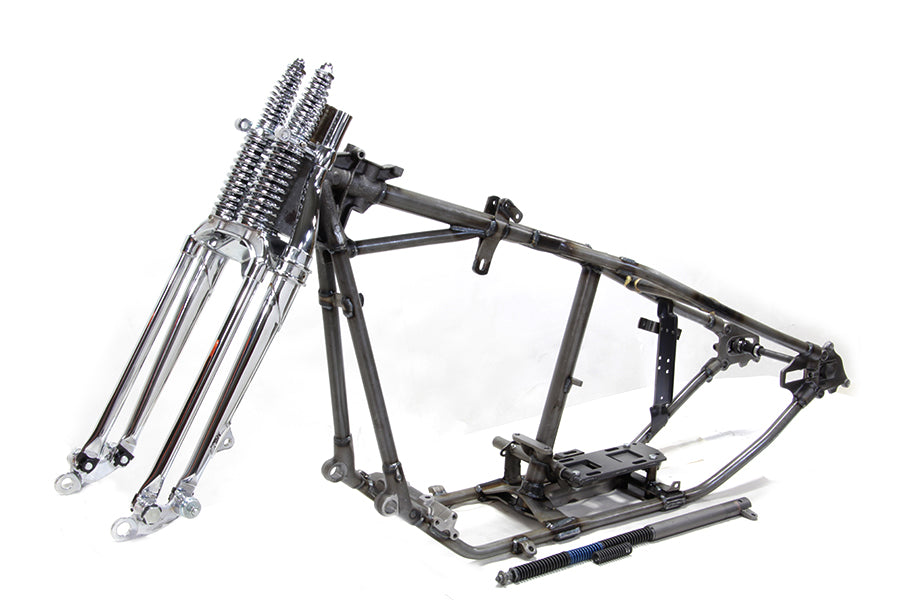 Frame and fork kit includes replica Knucklehead 30° rake frame and 28 offset spring fork assembly that features a chrome finish. Must order neck cup and race separately. *NOTE: There are no serial numbers stamped on the replica frame. V-Twin MFG supplys a Bill of Sale only referencing the part number.
