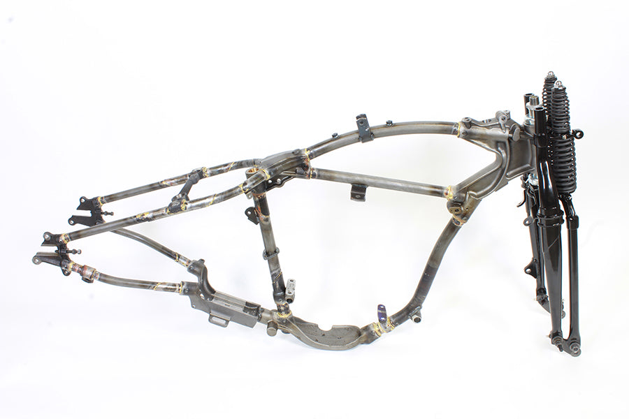 45 WL frame and fork kit includes a replica 45 W rigid frame a black 28 inline Spring Fork assembly and a zinc fork neck cup set. The stock replica Spring Fork assembly accepts all original style components and accessories for a detailed restoration look. The 45 rockers are mounted inside of the fork legs and accepts a 3/8 diameter axle. The replica 45 W stock style rigid frame with brazed joints features a raw finish. There's no Manufacturere's Statement of Origin only a Bill of Sale. Don't forget the pre-assembly procedure! Before primer and paint the frame will require de-greasing. Frame accepts 3 bolt transmission case. Top frame tube has threaded inserts to attach center tank panels. Threads are for #8822-18 bolt set. Fork assembly includes inner and outer springs front and rear legs and spring rod with bushings. Top clamp neck races and cone nut are not included.