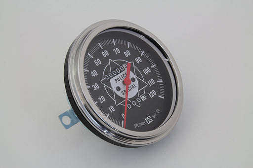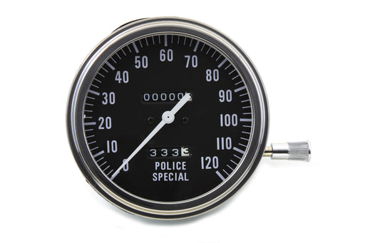 V-TWIN MANUFACTURINGIn stockPolice special speedometer has a ratio of 2:1 and features a black face with white numbers reading 0-120 mph and a white needle. Speedometer featur...