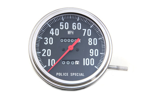 V-TWIN MANUFACTURINGIn stockPolice Special speedometer has a ratio of 2:1 and features a black face with red needle and white 10-100 mph numbering. Face and rim are not instal...