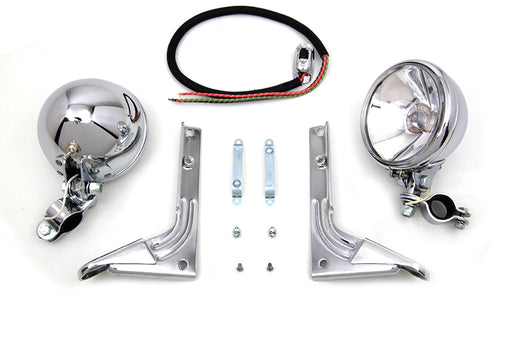 V-TWIN MANUFACTURINGOut of stockChrome kit includes two 12 volt 4-1/2 Replica style spotlamps with clamps toggle switch and hardware. Kit mounts on 1-1/4 front engine bar. *No...