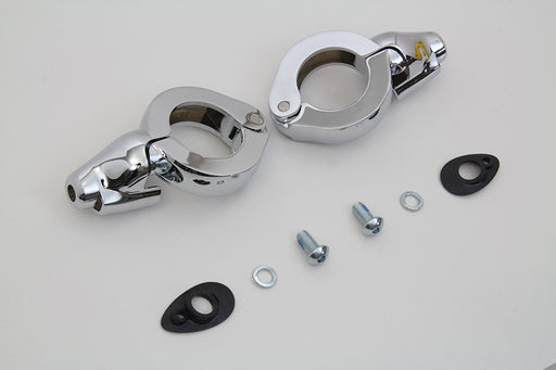 V-TWIN MANUFACTURINGOut of stockChrome grooved clamps will mount custom or stock turn signal lamps to 41mm forks. Clamp set features a hole drilled at edge of clamp for turn signa...