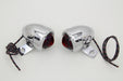 Guide bullet lamp set with red glass lenses for right and left front turn signal. Set of two. Right and left lamps are the same. Lenses are installed. Licensed guide bullet lamps have guide glass lenses installed cloth wires and brackets. Includes 6V bulbs with detialed guide markings stamped on the chrome bracket. *NOTE: Hardware not included. **NOTE: General Motors Licensed Guide Products.
