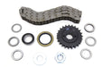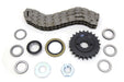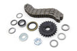 Engine sprocket and chain kit includes a 23 tooth splined motor sprocket nut with lock tab engine seal spacer shims and a York oval style 82 link primary chain.