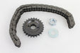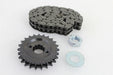 Engine sprocket and chain kit includes a 23 tooth splined motor sprocket engine sprocket nut and lock tab kit and a York double row 82-link chain.