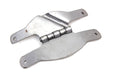 Rear rigid fender hinge assembly features a raw finish and includes a 2 piece hinge plate and pin. Must be riveted in place. Hinge holes measure 5.2 apart.
