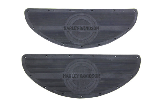 V-TWIN MANUFACTURINGLow stockHalf moon shaped footboard mats are made of black rubber with logo and rivet holes pre-punched in. Set of two. Mats are pre-drilled to accept stoc...