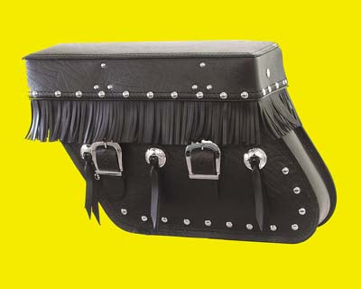 V-TWIN MANUFACTURINGOut of stockBlack leather saddlebag set with chrome mount plates conchos fringe and chrome rivets. 1950's restoration or for a Nostalgic style. *Note: UPS ma...