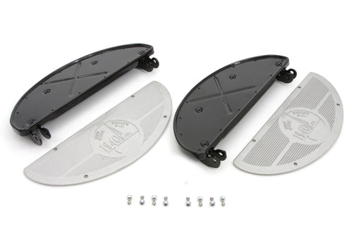 V-TWIN MANUFACTURINGIn stockBlack replica driver half moon footboard set features an alloy World's Fair design insert. Sold as a pair. Mounting bracket features 10 spacing.FI...