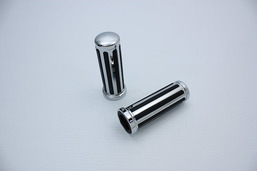 V-Fire black rubber rail style. Chrome die cast construction with black rails. For use with 1 handlebars. Sold in a quantity of 2.