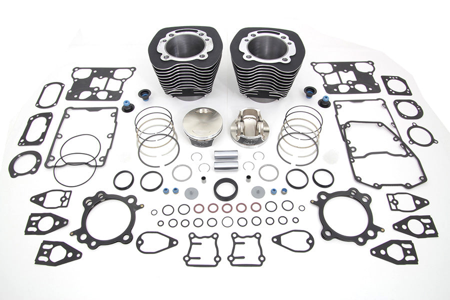 110 motorshop 4 big bore bolt on cylinder and piston kit takes your 96ci or 103ci motor to a full 110ci without removing the engine from the chassis. Features a black finish with aluminum high-lighted fin edges. Complete top end gasket kit is included with the fitted cylinders and Wiseco pistons. The 4 big bore cylinder and piston package increases the internal bore from 3-7/8 to 4 without increasing the outside diameter of the cylinder spigot. The cylinder slips into the existing case bore without modification. Kit will add 7 cubic inches of displacement for more torque throughout the RPM range. The kit includes front and rear cylinders and system-matched pistons with rings. The finished honed size of this bore cylinder is 4.005 . The compression ratio is 10.5:1. *NOTE: The base gaskets are not included.