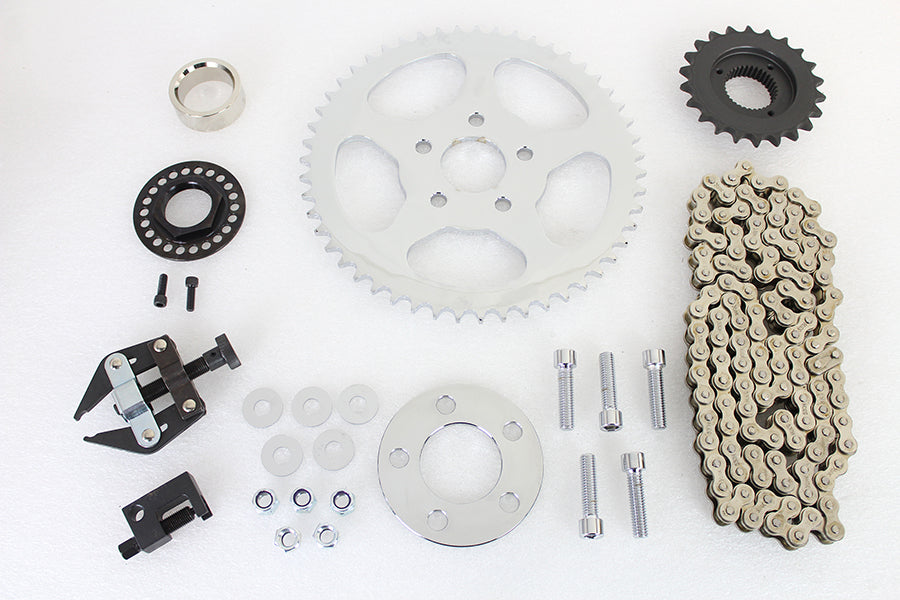 York Softail rear chain kit is for 5 speed models. Stock ratio is supplied with steel sprockets 22 tooth front and a 48 tooth rear. Converision kit includes everything needed to convert 1987-2006 5 speed belt drive system to a heavy duty 530 chain drive. This kit is for a stock size rear tire. Chain will have to be cut to length breaker and master link included. *NOTE: Use existing pulley spacer behind the transmission 22 tooth sprocket. *NOTE: 530 120 link heavy duty york chain included with chain breaker so installer can cut chain to desired length for each application. When using a 21 tooth front sprocket: 48 tooth rear sprocket = 4% deeper (faster acceleration) 49 tooth rear sprocket = 6.5% deeper and 51 tooth rear sprocket = 10.5$ deeper. When using a 22 tooth front sprocket: 48 tooth rear sprocket = 2.5 overdrive (more top speed) 48 tooth rear sprocket - stock belt drive ratio 49 tooth rear sprocket = 4% deeper (faster acceleration) and 51 tooth rear sprocket = 6% deeper.