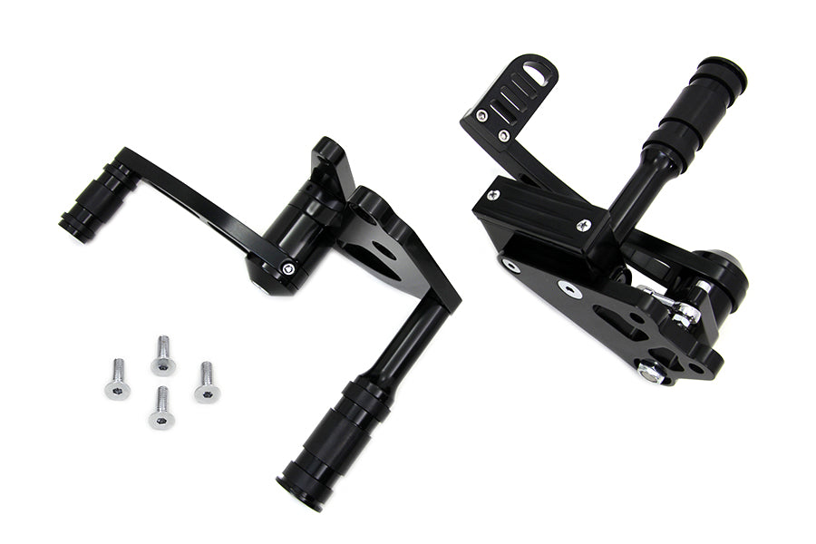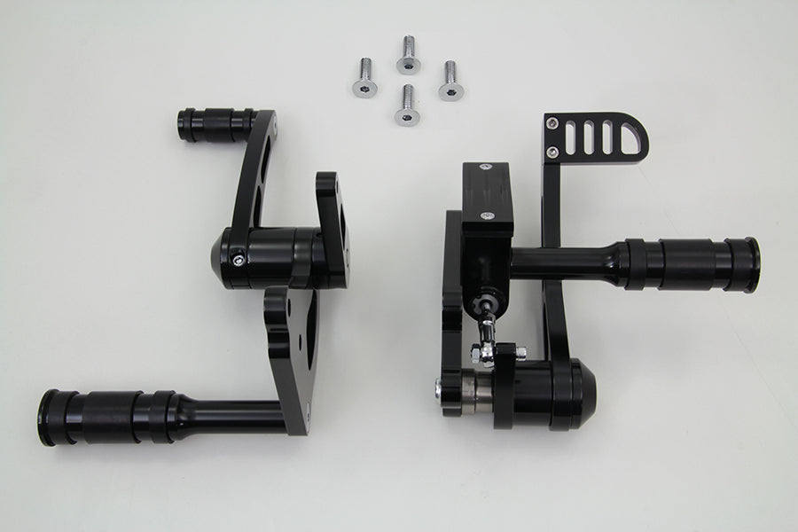 Black billet forward control kit includes rubber belted foot pegs shift side and brake side with 3/4 bore master cylinder.