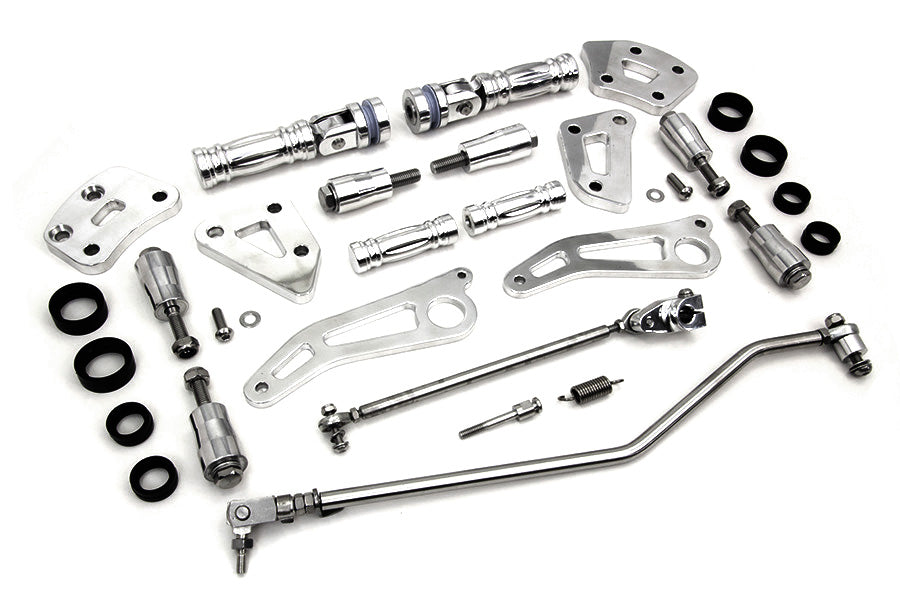 Polished billet forward control set includes rubber belted foot pegs and uses a stock master cylinder.