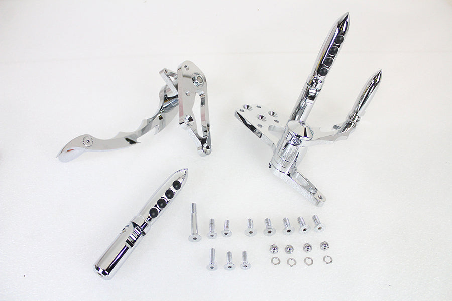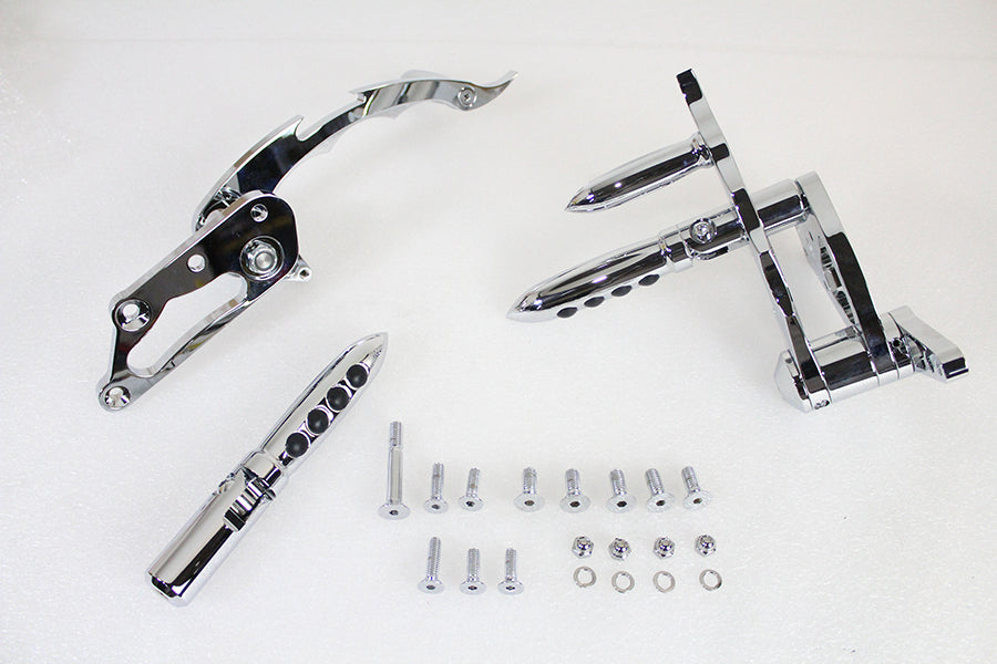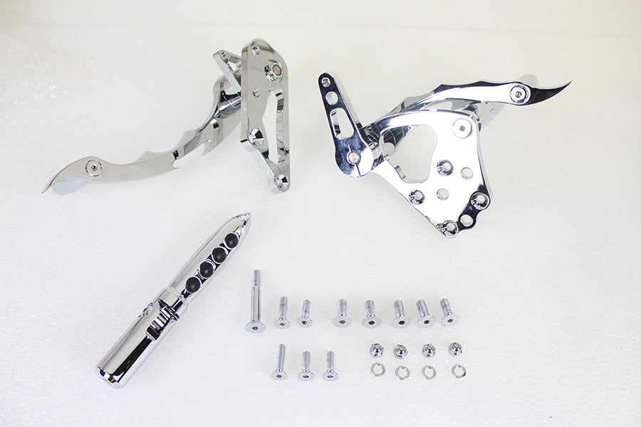 Custom chrome billet forward control kit requires use of the inline type master cylinder and fabrication of the shifter linkage. Includes footpegs and tribal cut control pedal.