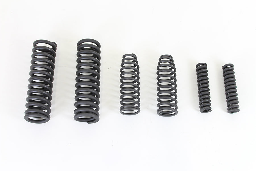 Parkerized spring set for Spring Fork front ends. 6 piece Spring Fork spring set includes: 2 lowers 2 uppers and 2 lower inner springs for VL I-beam Big Twin forks only. *NOTE: Large lower spring is 8mm wire.