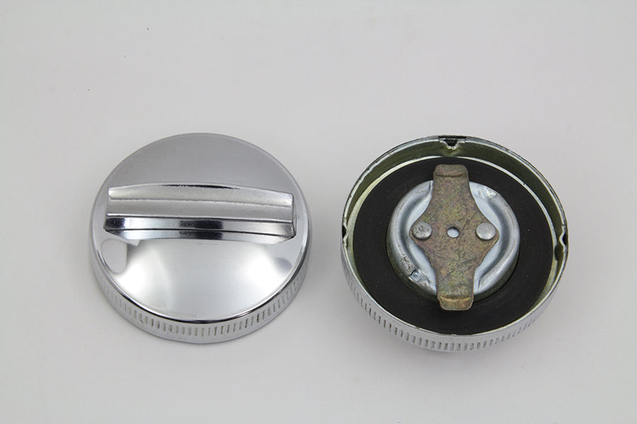 Replica Eaton style vented gas cap set features the original style with the rails mounted on top to help facilitate removal. The caps include E-mark on the underside. *NOTE: The top portion of the cap is chromed ABS plastic. Sold as a pair.