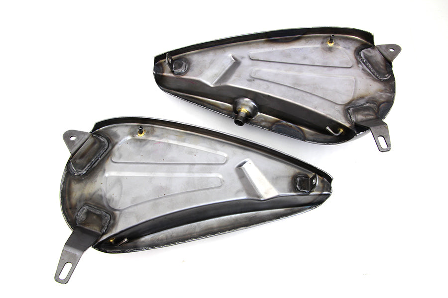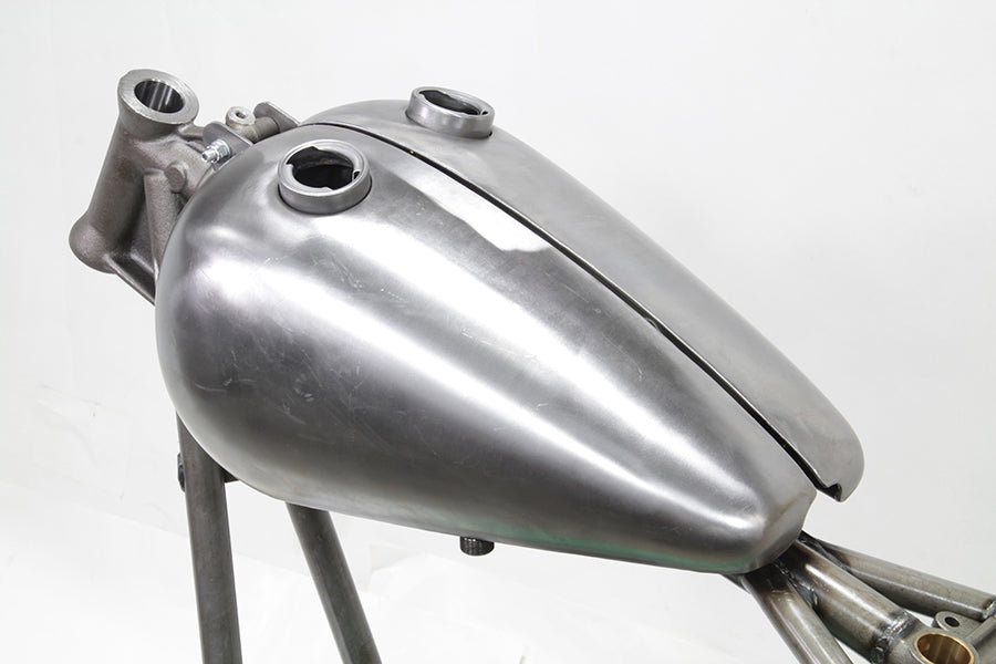 Tourist Trophy gas tank set with brackets is 2.8 gallons without the dash cutout featuring a raw metal finish constructed of steel. For use with bayonet type gas caps. Top is smooth type without dash base cutout. Use for either 2 side of gas or 1 side oil on the right. The right side has two front 3/8 NPT and one 1/8 NPT male fittings for use as an oil tank. The left side accepts metric nut type petcock. Order hardware separately fittings and plugs not included. *NOTE: The rear mount bar has 5/16 x 24 threads which mounts to the seat T tab on the frame. *NOTE: Rear connector bar may have to be spaced out or shortened for proper fitting of tanks on frame. Rear tank mount bracket may be modified if builder would like the rear of the tank to sit lower.