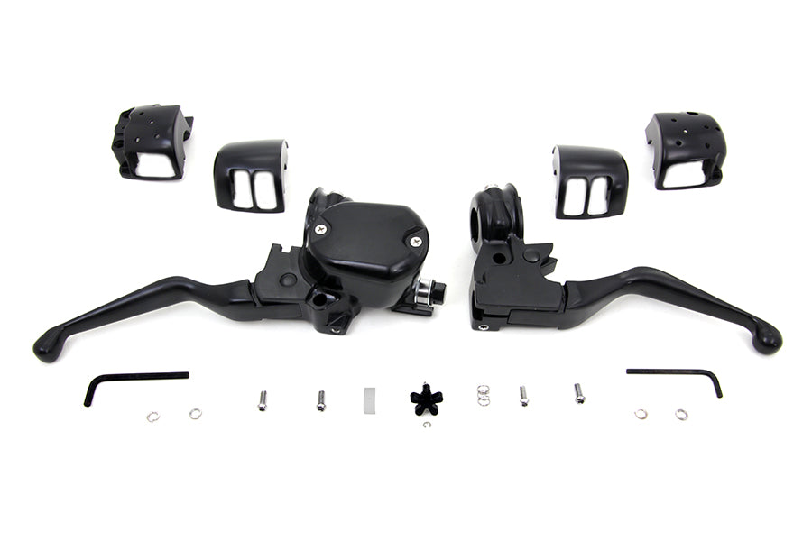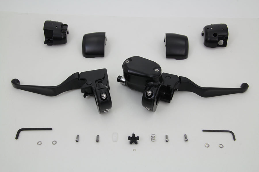 Black handlebar control kit dual disc includes 9/16 bore master cylinder clutch handle with clamp two pairs of switch housings and a 12mm banjo bolt.
