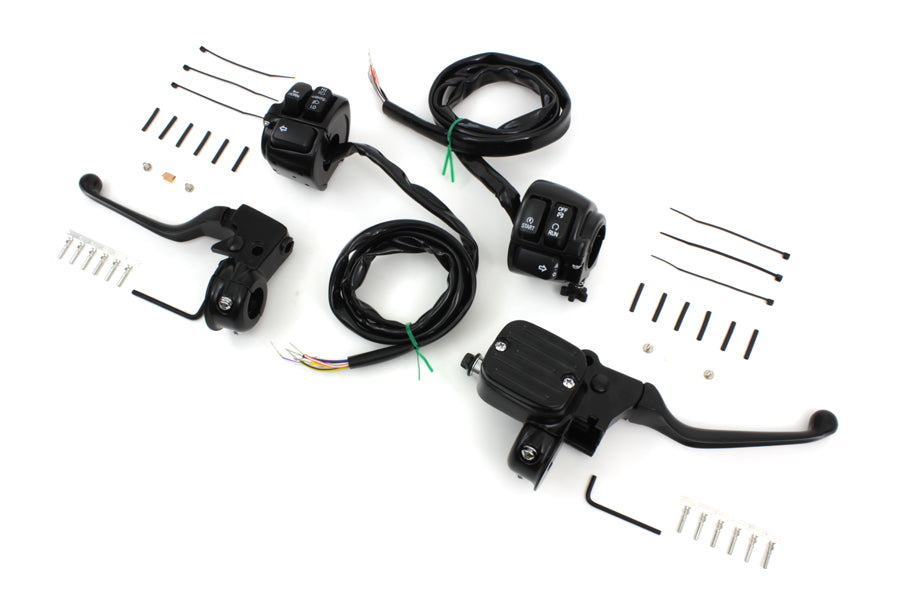 Handlebar control kit with switches includes a 11/16 bore master cylinder clutch handle with clamp and 2 pair of switch housings with 48 wires for dual disc.