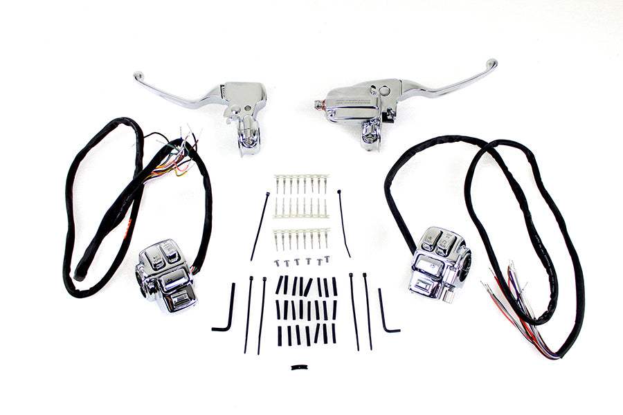 Complete assembly includes brake master cylinder with a 15mm bore and wires switches for dual disc models with audio.