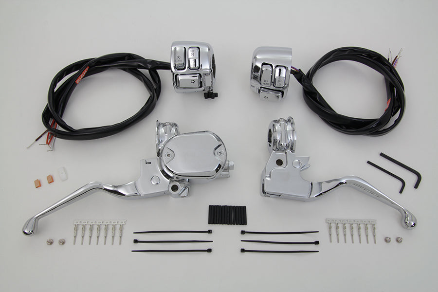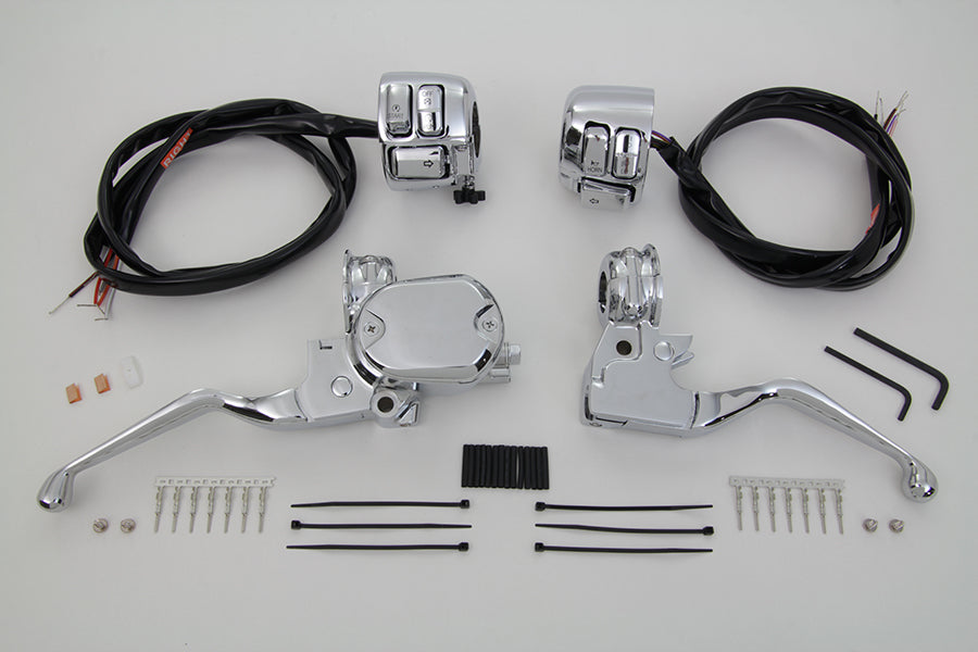 Single disc chrome handlebar control kit includes a 1/2 bore master cylinder with wired switches and a clutch handle with the clamp.