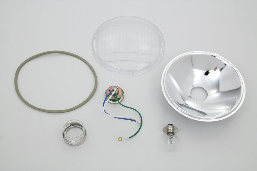 Parts kit for Spring Fork headlamp includes reflector socket gasket glass lens and 12 volt stock type bulb.