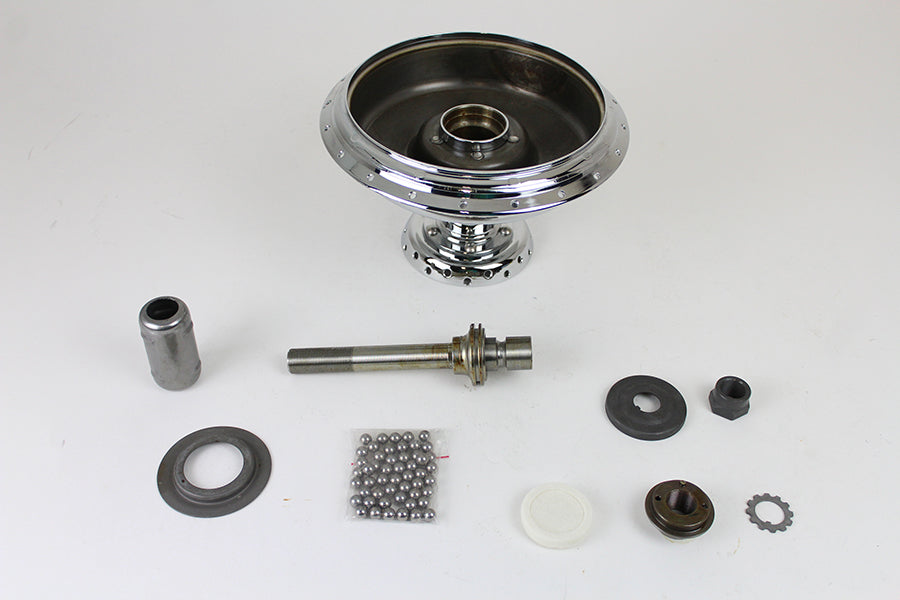 45 W front wheel hub assembly features a chrome finish. *NOTE: We suggest using 24mm long nipples when lacing 45 Front drum wheels.