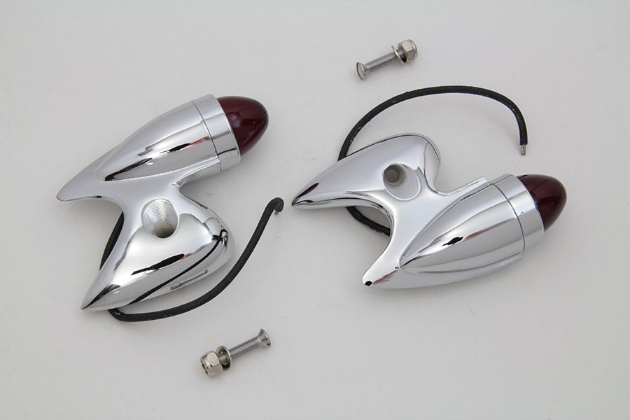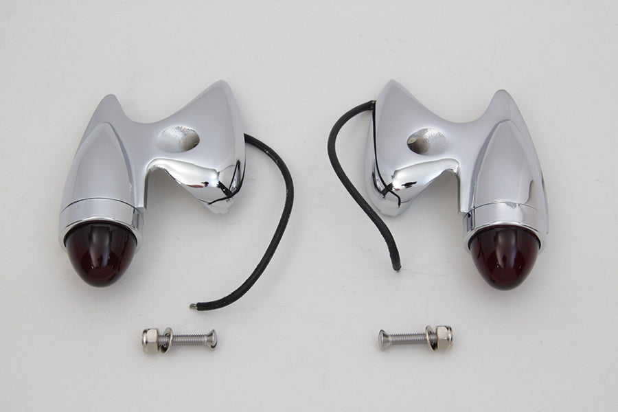 Chrome right and left side 12 volt 3 watt gunner tail lamps with die cast outer diameter featuring glass red lenses. Two holes are required per lamp. The required holes include a #10 mount hole and a location hole. In order to achieve the #10 mount hole a tail gunner light mounting drill is required. Lamp set is accurately die cast body as the original with exclusive V-Twin MFG tooling.