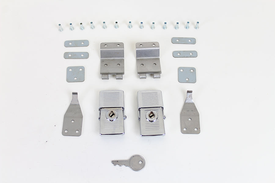 Saddlebag lock kit is for both the right and left sides as pictured. The lock kit is chrome. Kit includes all pieces for both bags. The content of the kit includes two lock/latch plates two lock back plates two keys twenty 3/8 long rivets and four strips. Includes two keys. The outer latch cover is chrome and the hinge and hooks are zinc plated. Only fourteen rivets are required. The longer rivets (3mm x 10mm) are for the 6 holes in the triangle bracket. *NOTE: Component diagram shown.