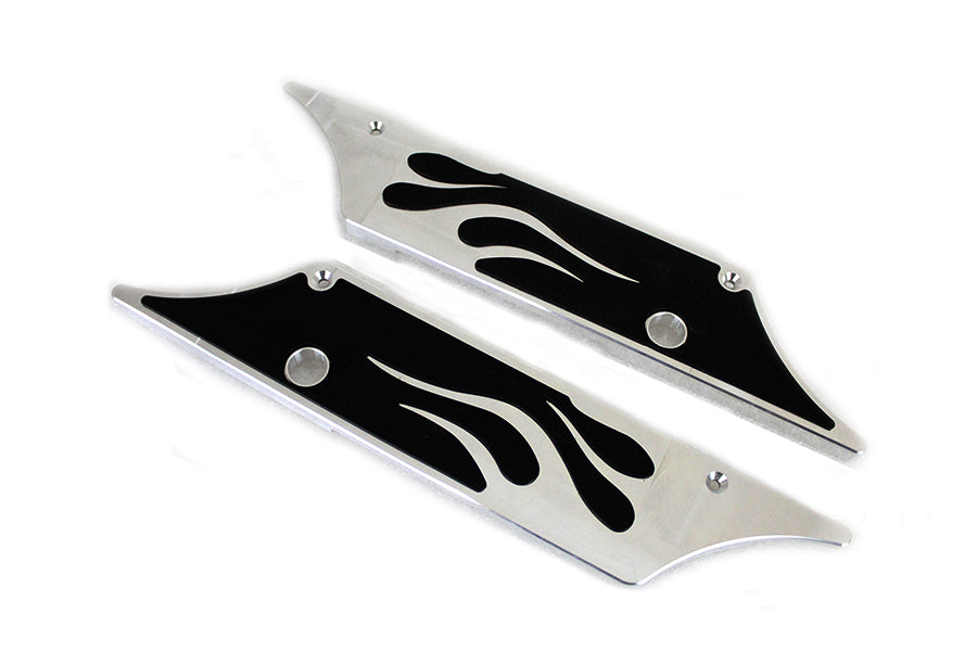 Saddlebag latch cover set features chrome face plates with black flame design inserts.
