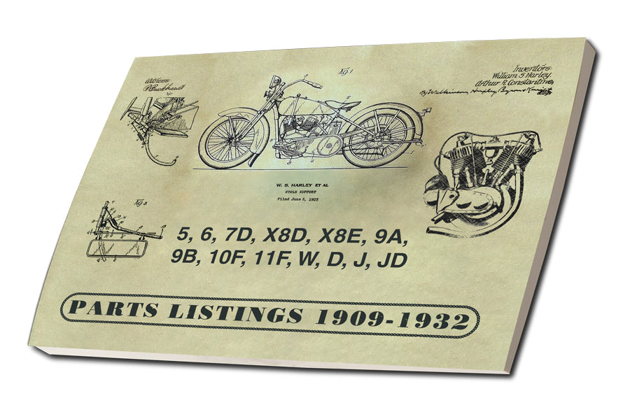 Parts book for 1909-1932 V-Twins features illustrated component parts with OE numbers. **NOTE Product may not be returned. ISBN: 978-1-7327387-4-4.