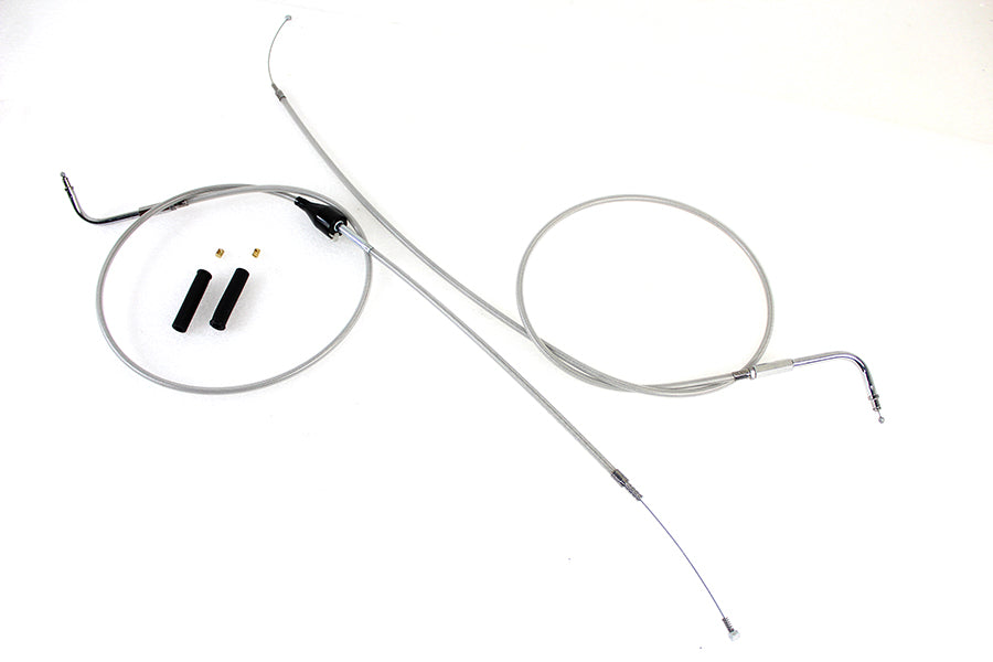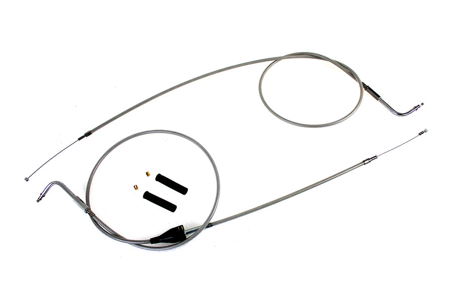 Throttle and idle cable set in braided stainless steel with a clear coat is 8 over stock length. Stainless steel braided with a clear coat throttle and idle cable set includes the cruise control switch and 90° elbow fitting. The stainless steel braid is tightly woven for a bright quality consistent finish. The clear coat is UV resistant heat bonded non yellowing grade for a long service life.