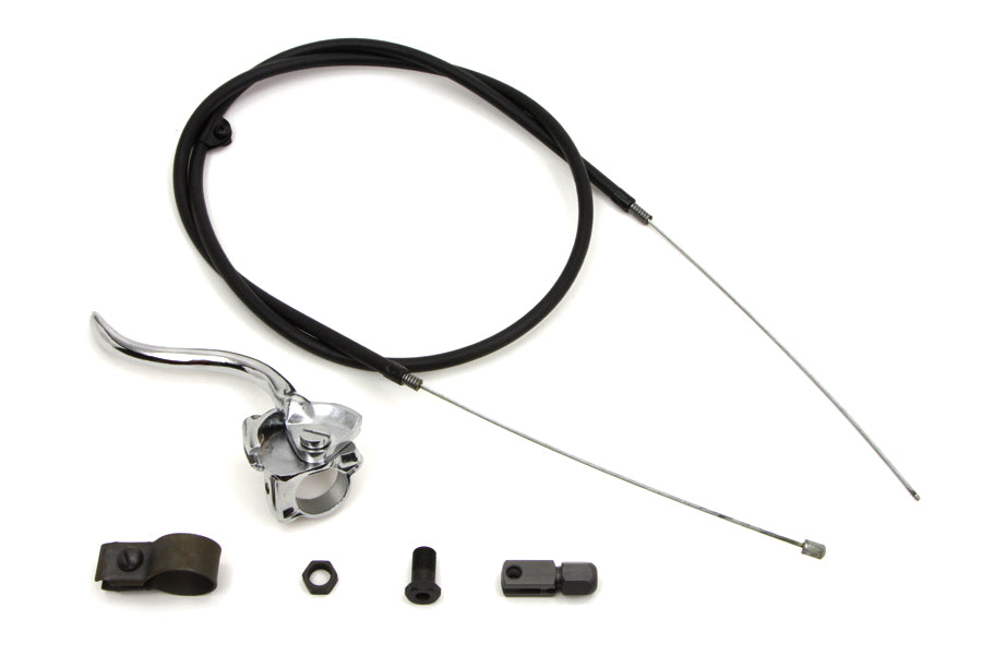 Brake handle cable kit includes chrome brake hand lever assembly with original style adjuster cable cinch inner and outer cable with oiler and cable clamp for mounting to bars. The cable adjuster featured in this kit fits 1936-40 Spring Fork brake backing plates.