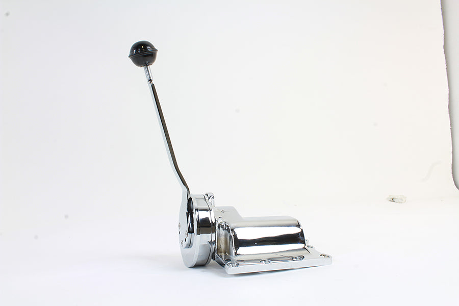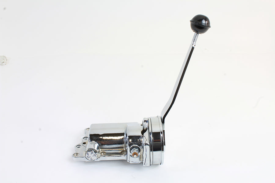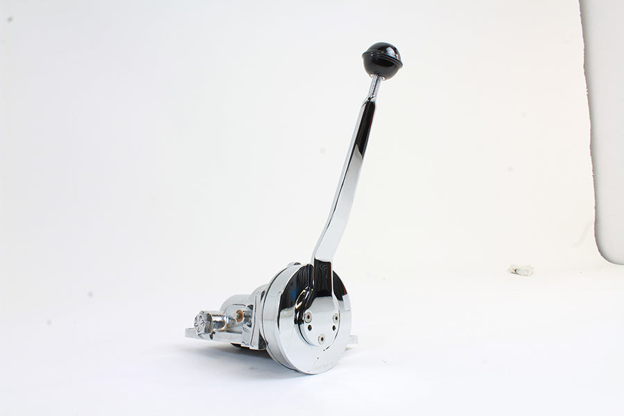Chrome finish ratchet top transmission is fully assembled with all internal components. Top will allow forward push to shift up for 4-speed transmissions. Slap stick is chrome with black ball.