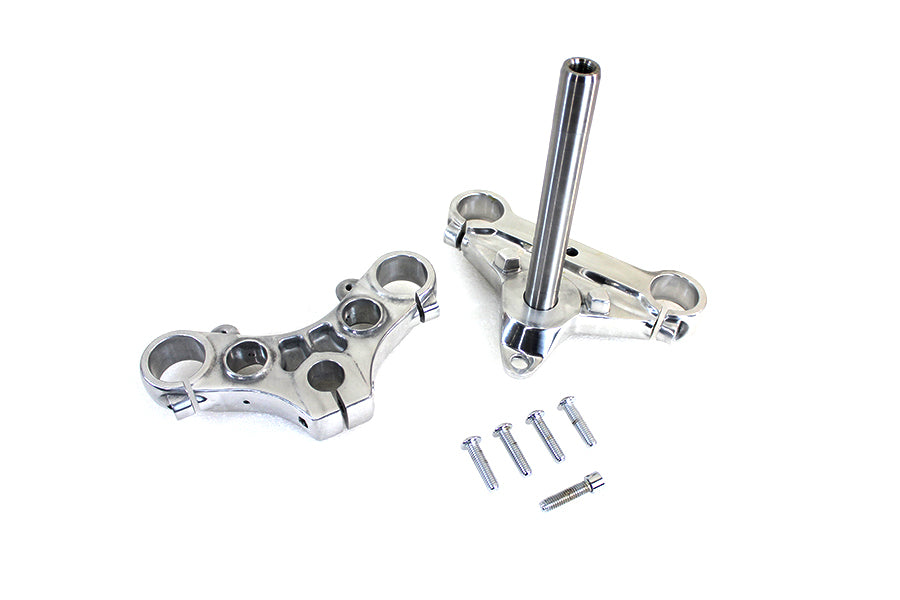 Polished triple tree set includes upper and lower trees with removable threaded stem. Accepts 39mm fork tubes. Set does not include 1 bearings top nut and dust covers must order separately. *NOTE: Tree set accepts top nut with 5/8 x 18 threaded stud.