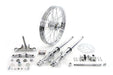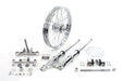 Hard chrome wide glide fork assembly with chrome sliders are assembled with internal components. Includes a 21 chrome wheel assembled with bearings 2 drilled 11-1/2 brake discs with chrome screws and a chrome dual disc caliper and disc bolts.