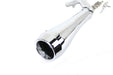 Chrome 1-3/4 Wyatt Gatling header pipes features a 4 taper megaphone with chrome billet end caps and a form fitted heat shield set. The high style front pipe fits nicely between the air filter and top of the cam cover. The megaphone end follows the swing arm back and ends in front of the lower shock mount. Megaphone features baffles.