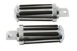 Male end mount footpeg set features molded rubber inserts in a chrome die cast metal peg. Unit features adjustable angle position which is accomplished through a center allen screw. These pegs have exposed rubber on the underside. Sold as a pair. *NOTE: These will not fit passenger on 2018-up Softail models. Bolts available separately; V-Twin #37-0020 chrome bolt set and #37-1679 zinc bolt set.