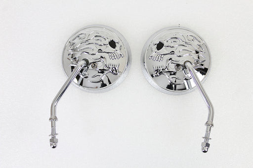 V-TWIN MANUFACTURINGOut of stock4-1/2 round style mirror set features a chrome die-casting with a chrome skull with black eyes and hi-lites and a chrome flame design on 4 one p...