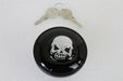 Keyed vented gas cap features a black finish with a chrome skull with black eyes Includes key locks.