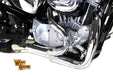 Chrome Wyatt Gatling 1-3/4 2 into 1 exhaust header set is a one piece design featuring a turn out muffler and form fitted heat shield set. The turn out end is 3 in diameter. Has 18mm oxygen sensor bungs but may be capped off if not required. Pipe set includes non-removable baffles. *NOTE: 2004-2006 carburetor models will require seperate purchase of #30-0423 O2 sensor bung plugs.